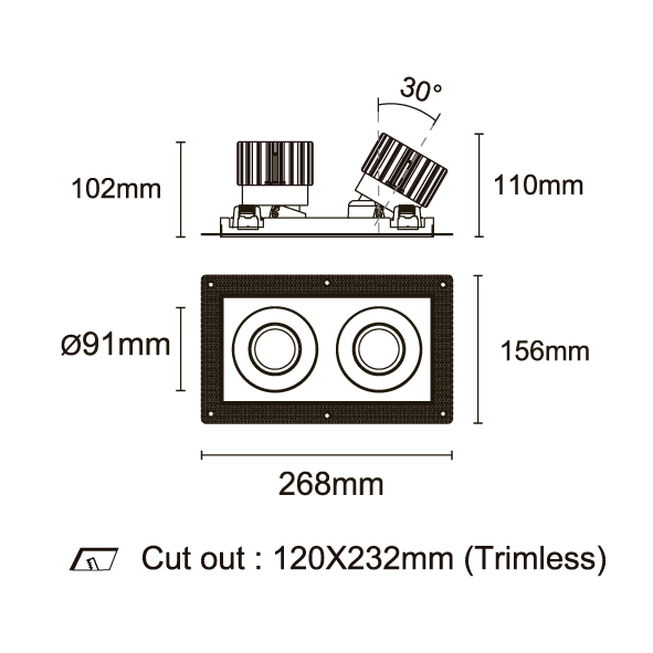ESB 型號 ESB35-TF2-WH-RGAGA00-WH-ACOT72 瓦數30Wx2 電流/電壓700mA 光源流明2873lmx2 角度 30°/40°/50°/55° 色溫3000K *另也有其他色溫的選擇 演色性90+ UGR IP44 顏色